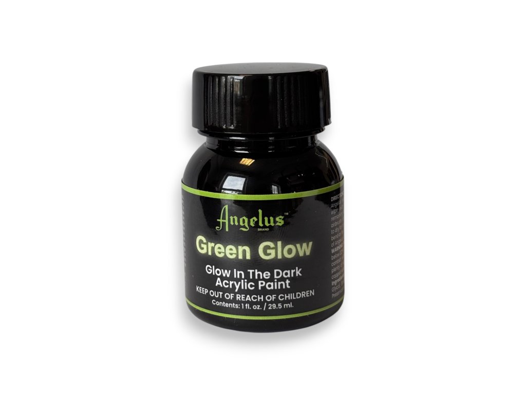 Angelus Glow in the Dark Leather Paint je speciální akrylová barva určená pro barvení kůže, která po nasvícení svítí ve tmě. Oproti běžným fluorescenčním barvám nabízí výrazně vyšší intenzitu svitu a dlouhou výdrž – při správném použití až cca 2 000 minut.