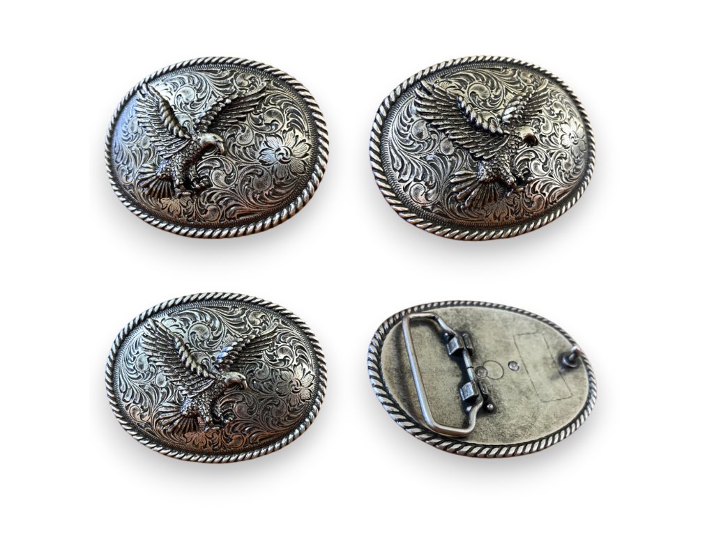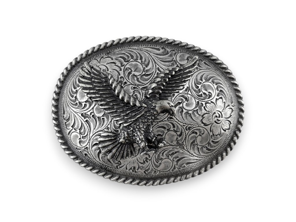 Westernová přezka Eagle v povrchové úpravě starý nikl kombinuje reliéfní rytinu s výrazným orlem v letu.