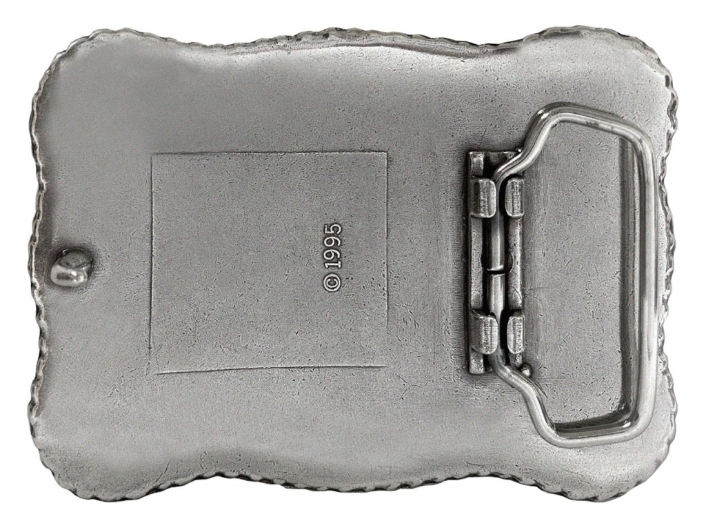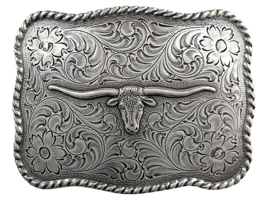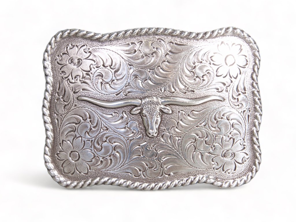 Elegantní westernová přezka s motivem hlavy longhorna v klasickém stříbrném provedení, která dodá vašemu opasku výrazný a osobitý styl.