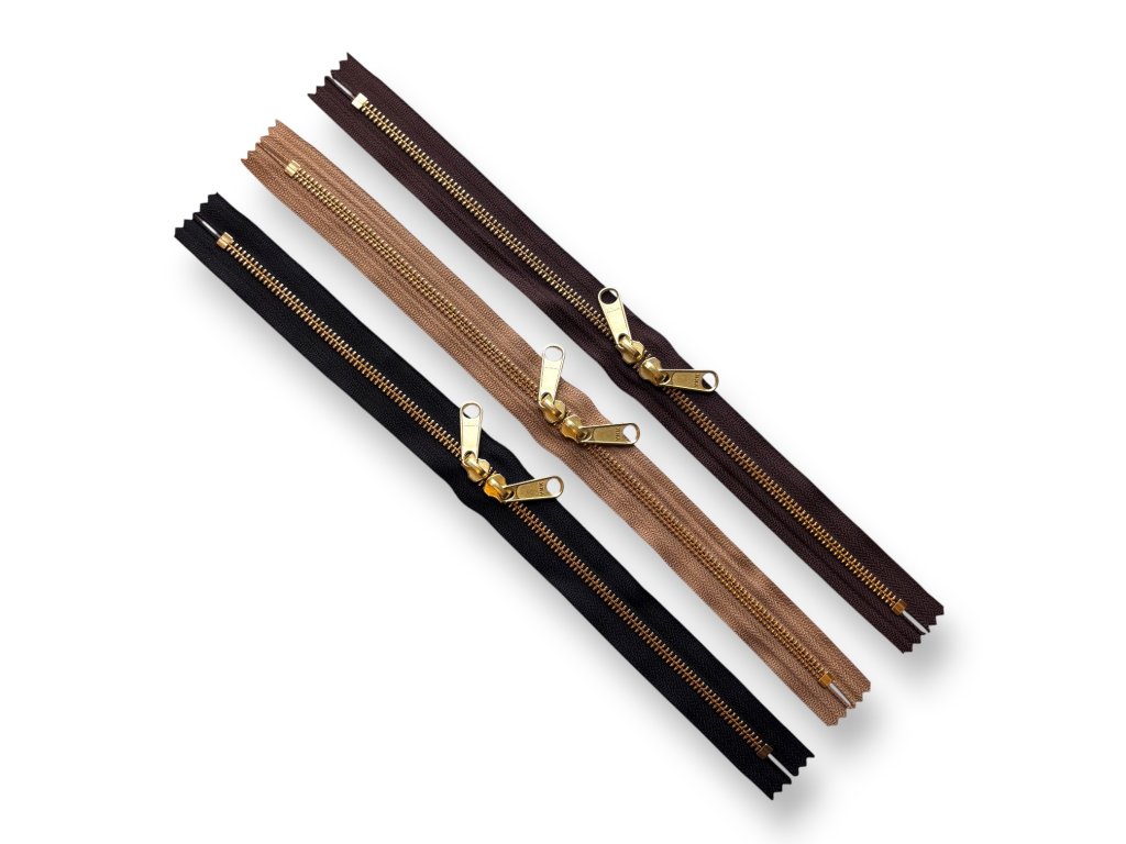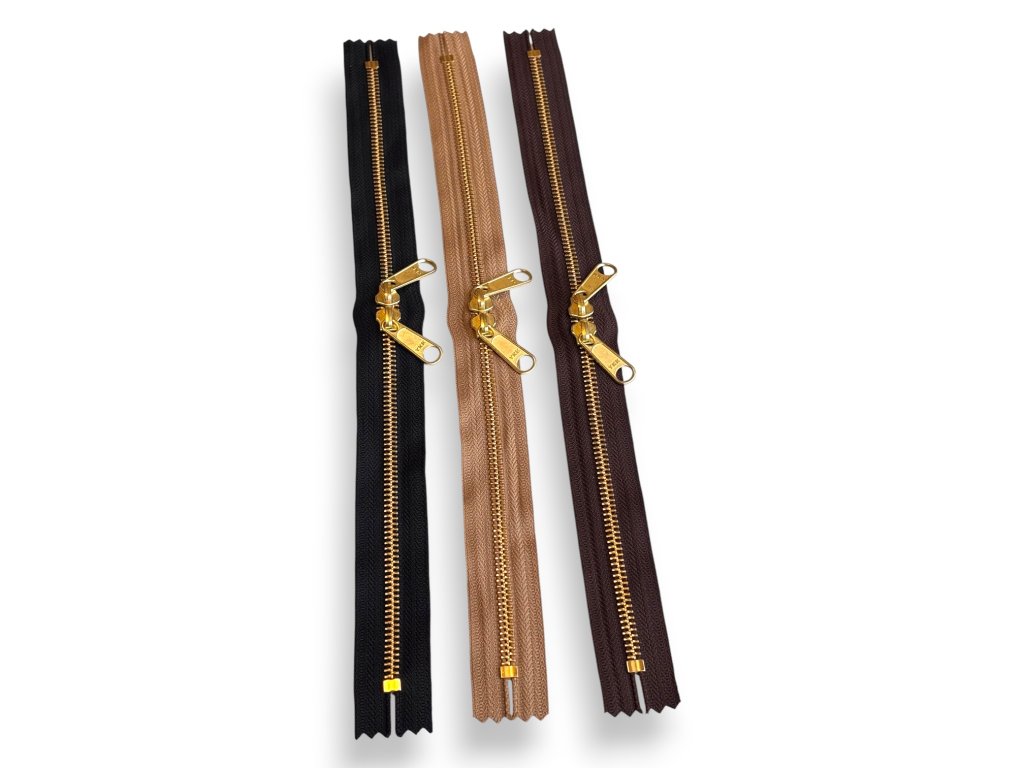 Dvoucestný nedělitelný kovový zip s mosaznými zuby a dvěma jezdci bez aretace. Jezdci jsou orientováni proti sobě a umožňují otevírání zipu směrem od středu. Vhodný pro peněženky, tašky, batohy a kabelky.